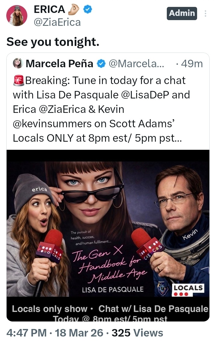 🚨Breaking: Tune in today for a chat with Lisa De Pasquale (X: @LisaDeP) and Erica @Erica (X: @ZiaErica) & Kevin (X: @kevinsummers) Scott Adams’ Locals ONLY at 8pm est/ 5pm pst